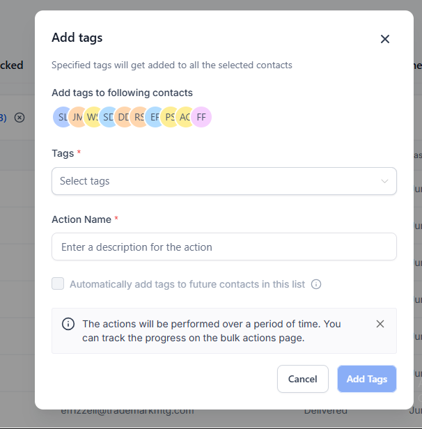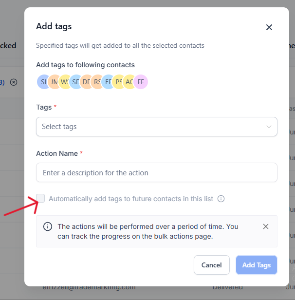 To auto-tag future contacts: Select All → Add Tags → Enable Auto-Tagging