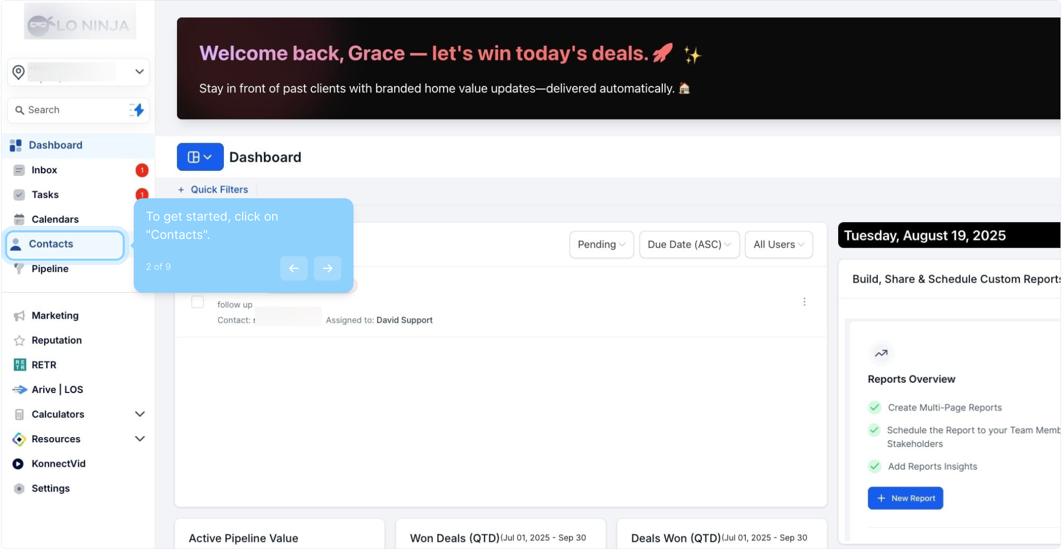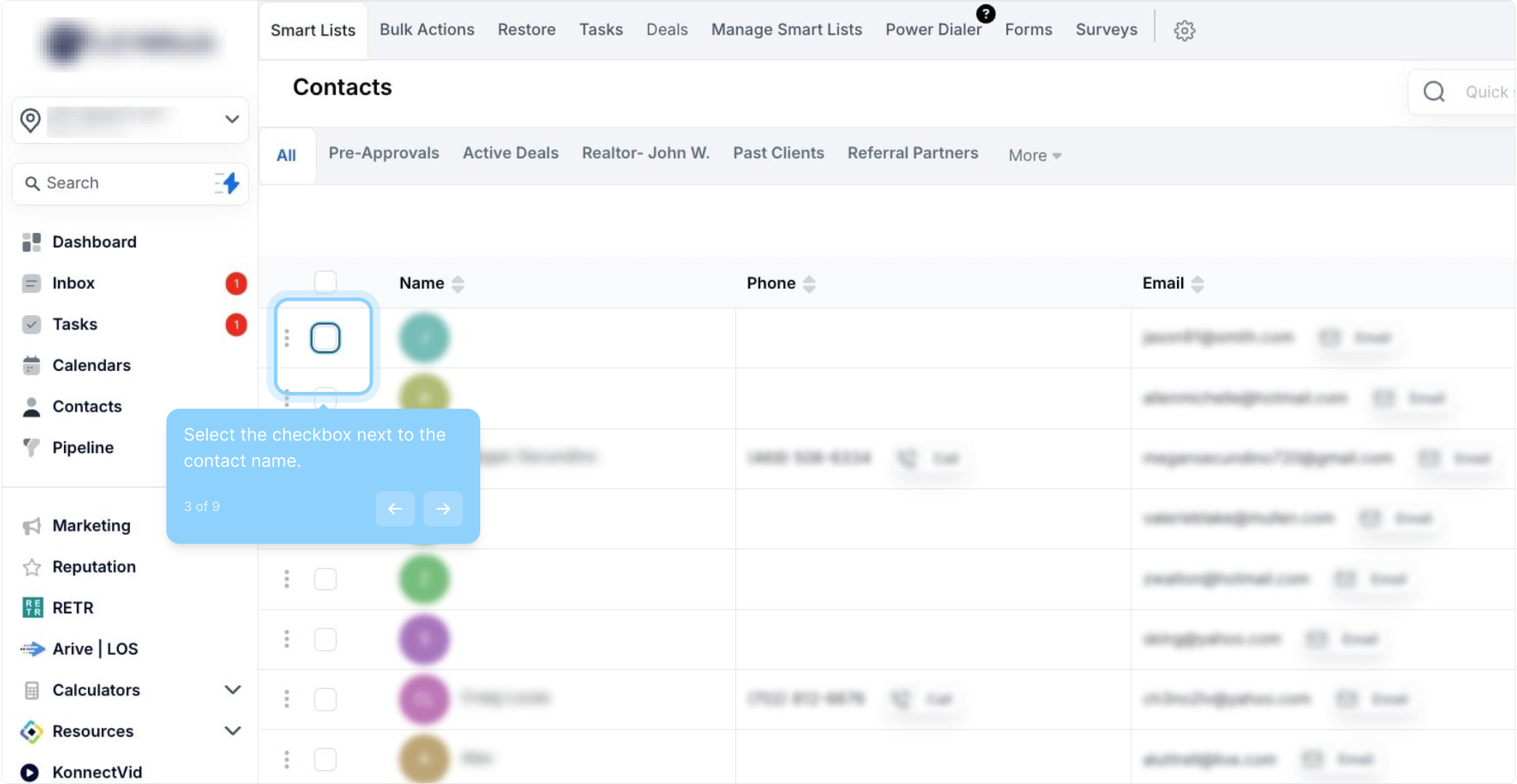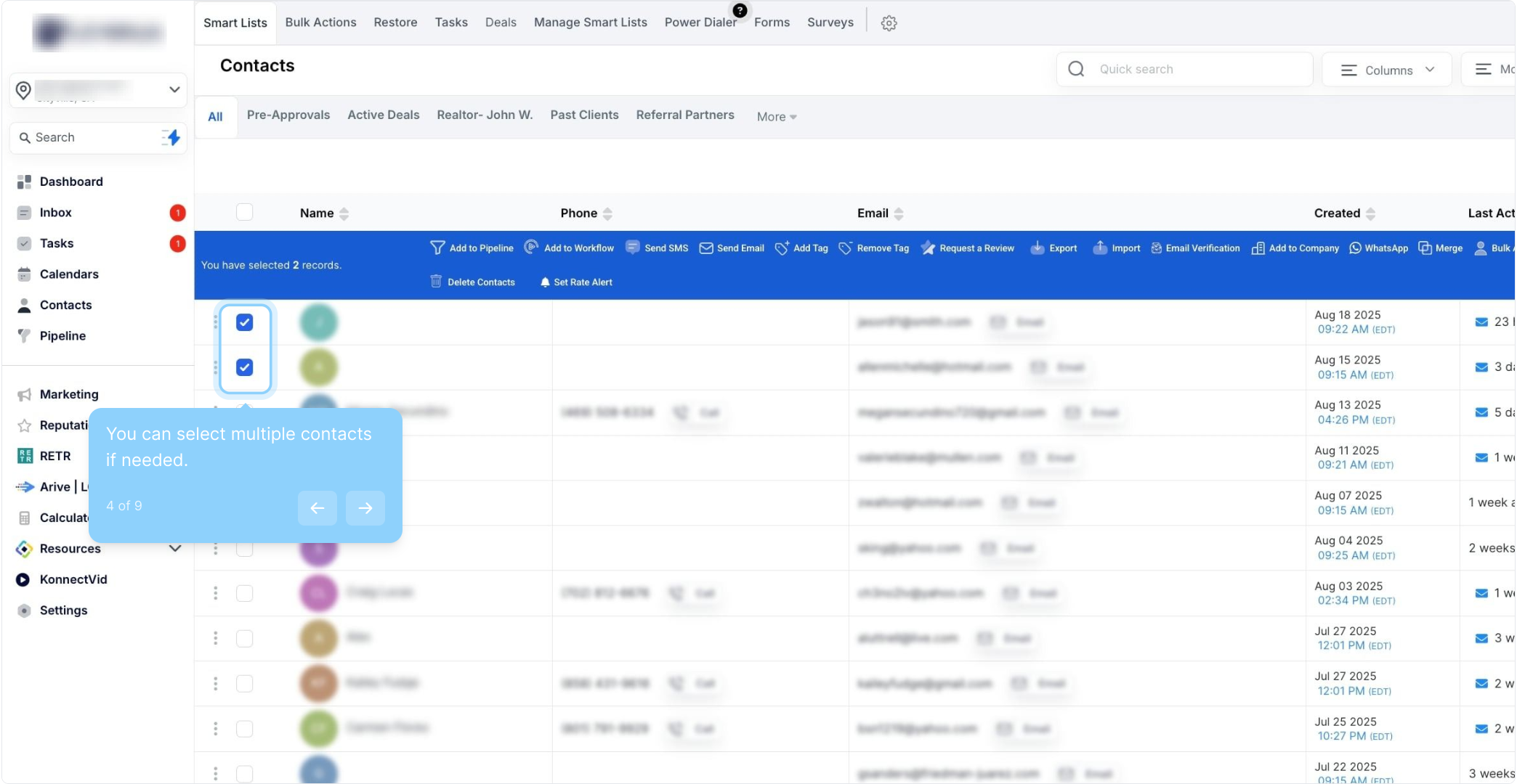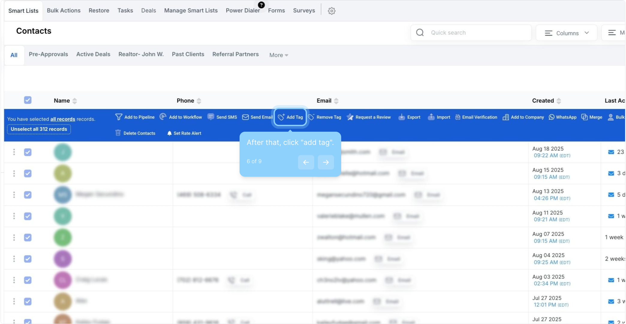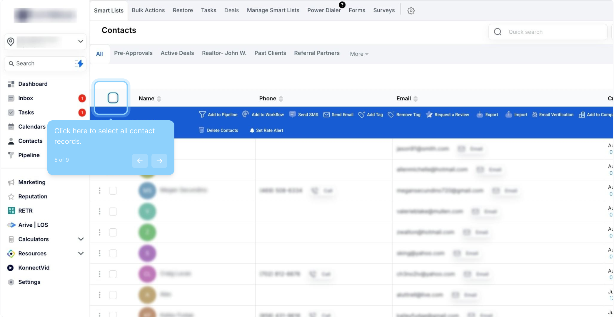 A: Navigate to your Contacts or Smart Lists section and check the box at the top of the list to select all contacts on that page. To select all contacts in your company, click the hyperlink that appears after selecting the page contacts.