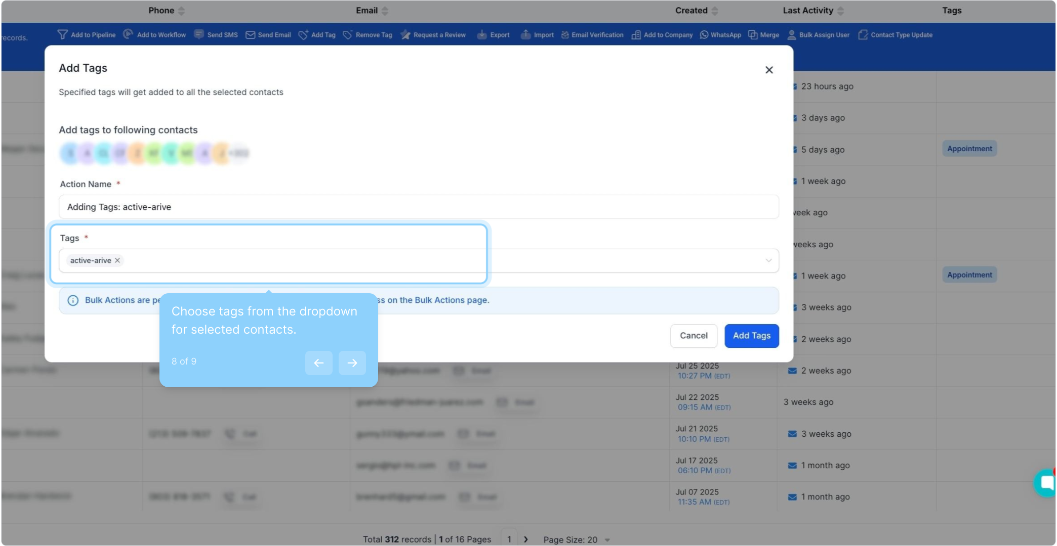 A: Yes, you can add multiple tags to selected contacts at once. In the pop-up window, type in keywords and select one or more tags to apply. Click "Add Tags" to apply them to the contacts.