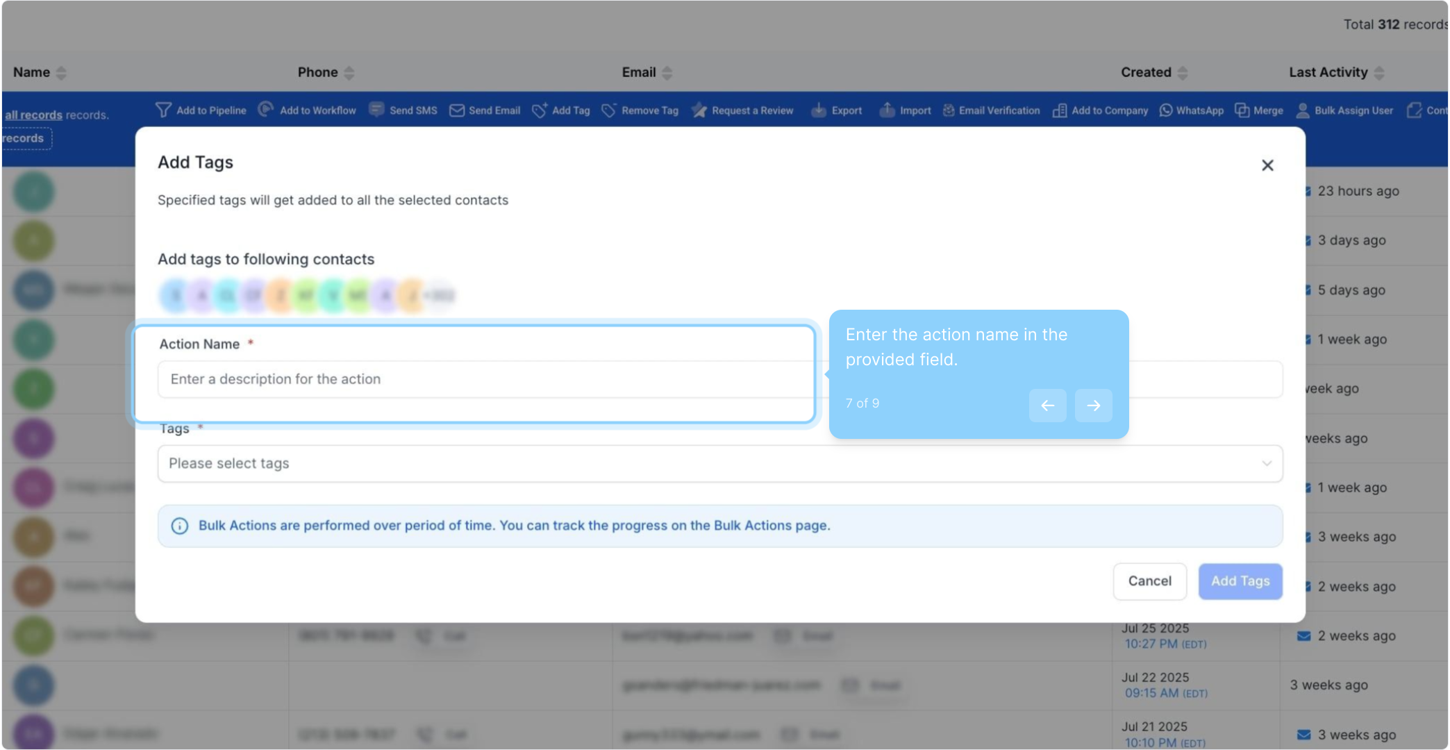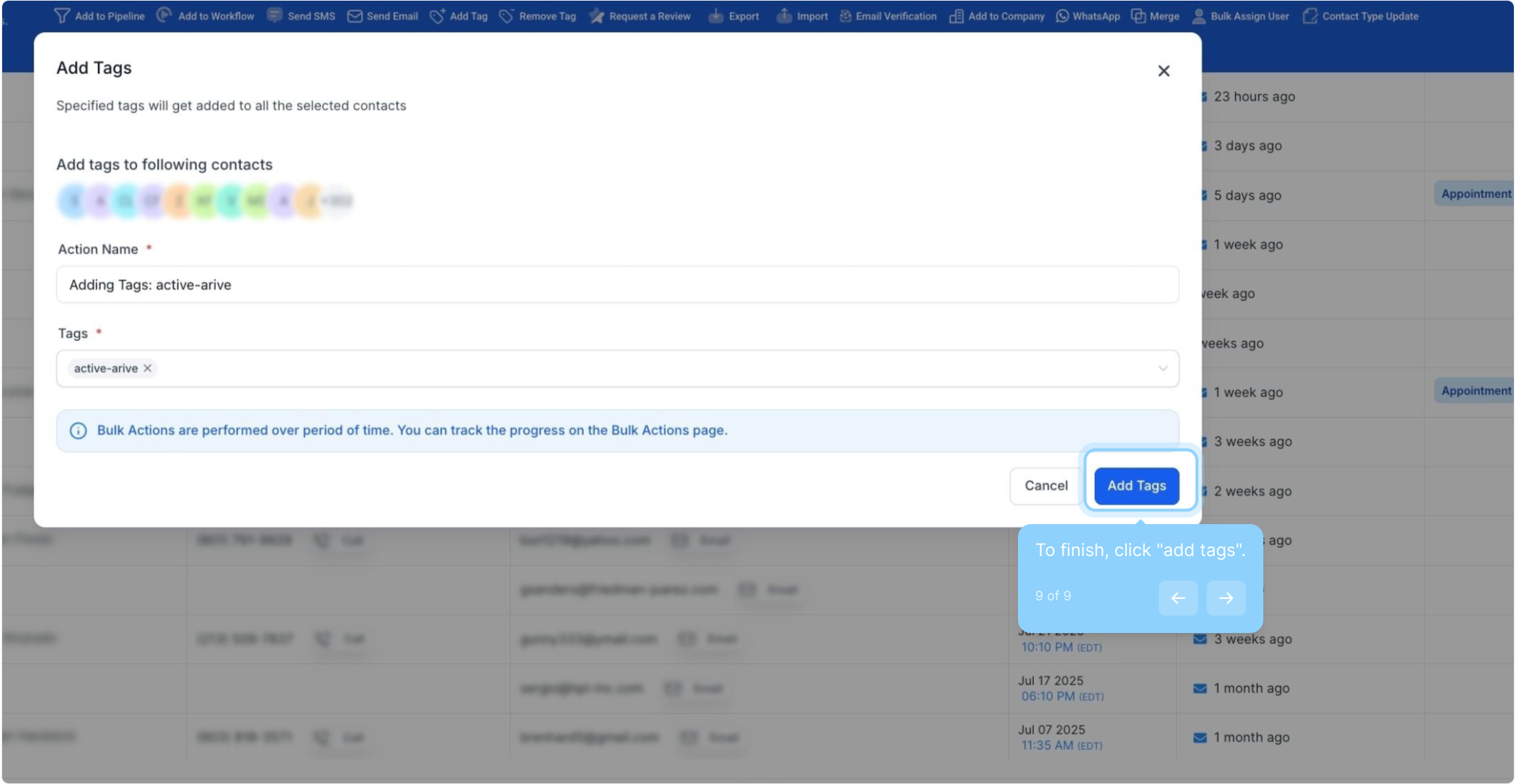 Q: Can I add multiple tags to contacts at once using the bulk action feature?