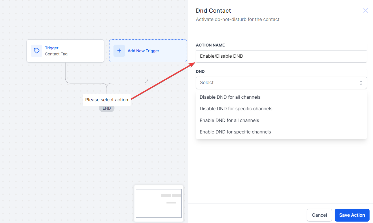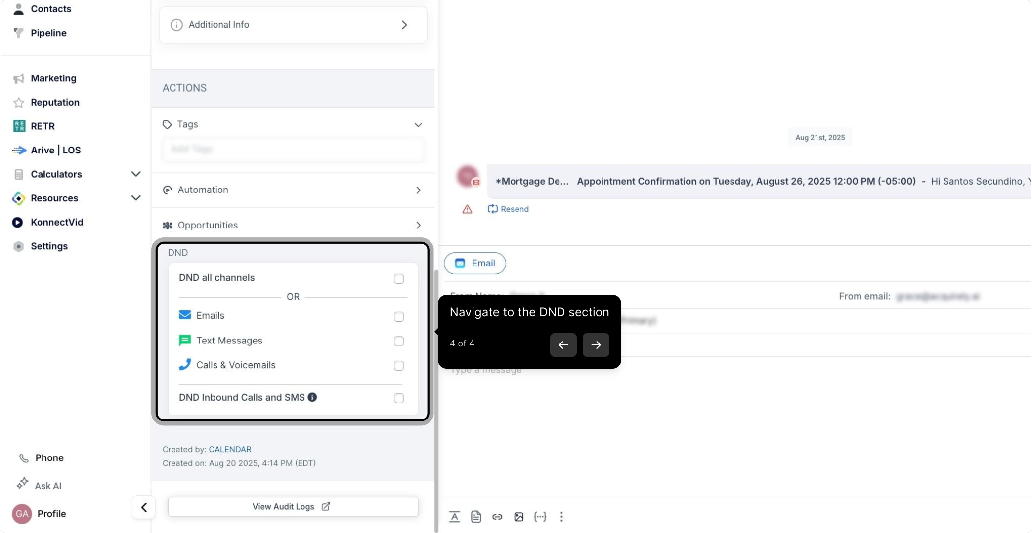 Under “DND” you’ll see checkboxes for DND all channels, or individual channels for aspects of you may use to communicate with contacts - from Email, SMS, FB messenger, WhatsApp and more.