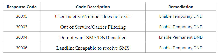 Types of SMS DND: There are two types of DND for SMS: temporary (for error codes 30003, 30005, 30006) and permanent (for error code 30004 or opt-out keywords).
