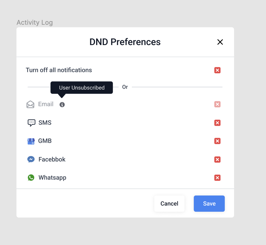 If a contact unsubscribes from any communication channel, will default to enabling DND for all channels. You can manually adjust these settings to re-enable communication on specific channels if the contact still wishes to receive messages through them.