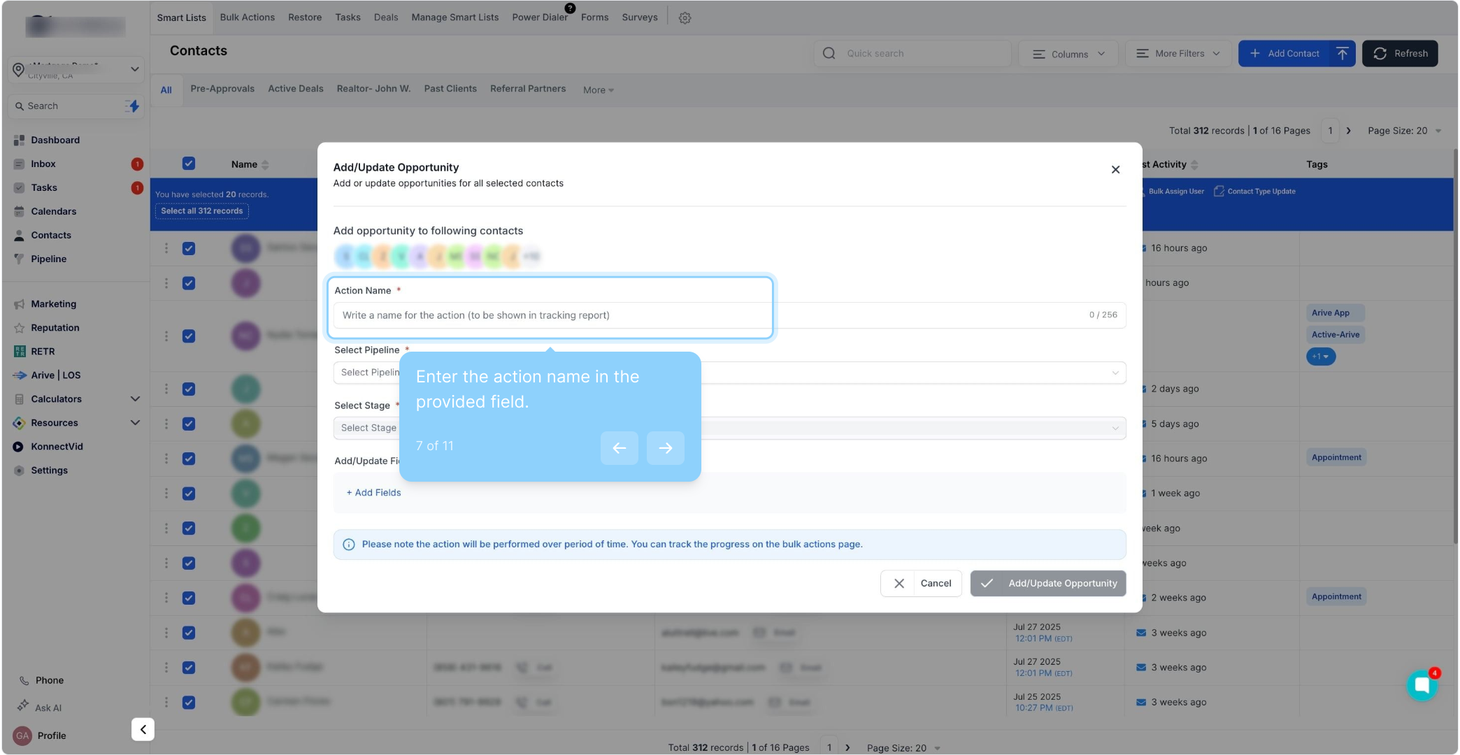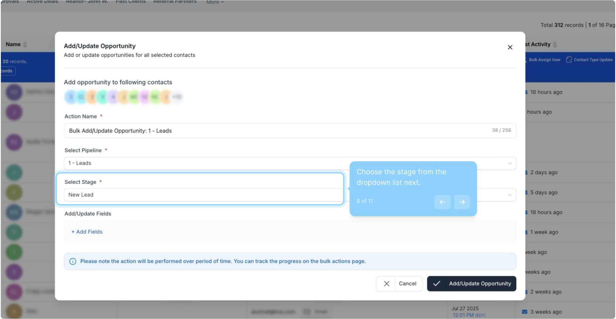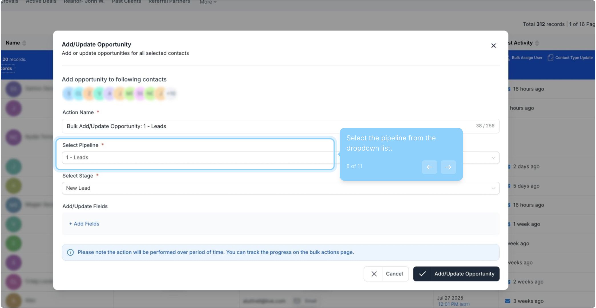 In the “Add/Update Opportunity” window, select the desired pipeline, stage, opportunity, lead value, opportunity status, and any other necessary details.