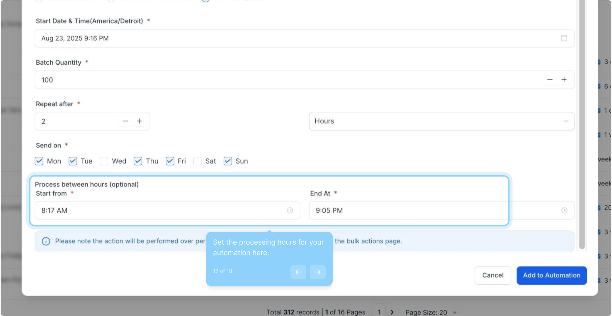 17. Set the processing hours for your automation here.