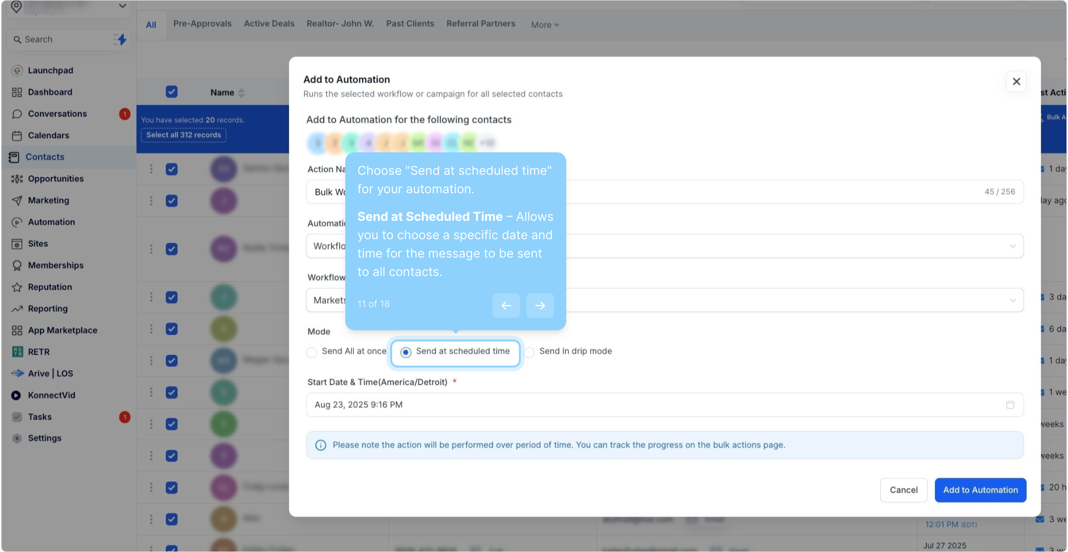 11. Choose "Send at scheduled time" for your automation. Send at Scheduled Time – Allows you to choose a specific date and time for the message to be sent to all contacts.
