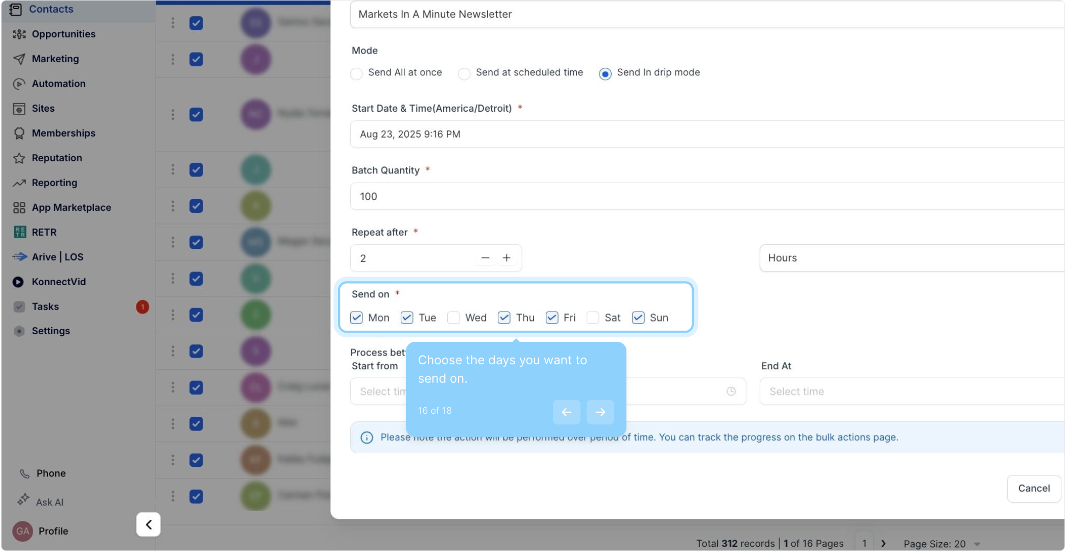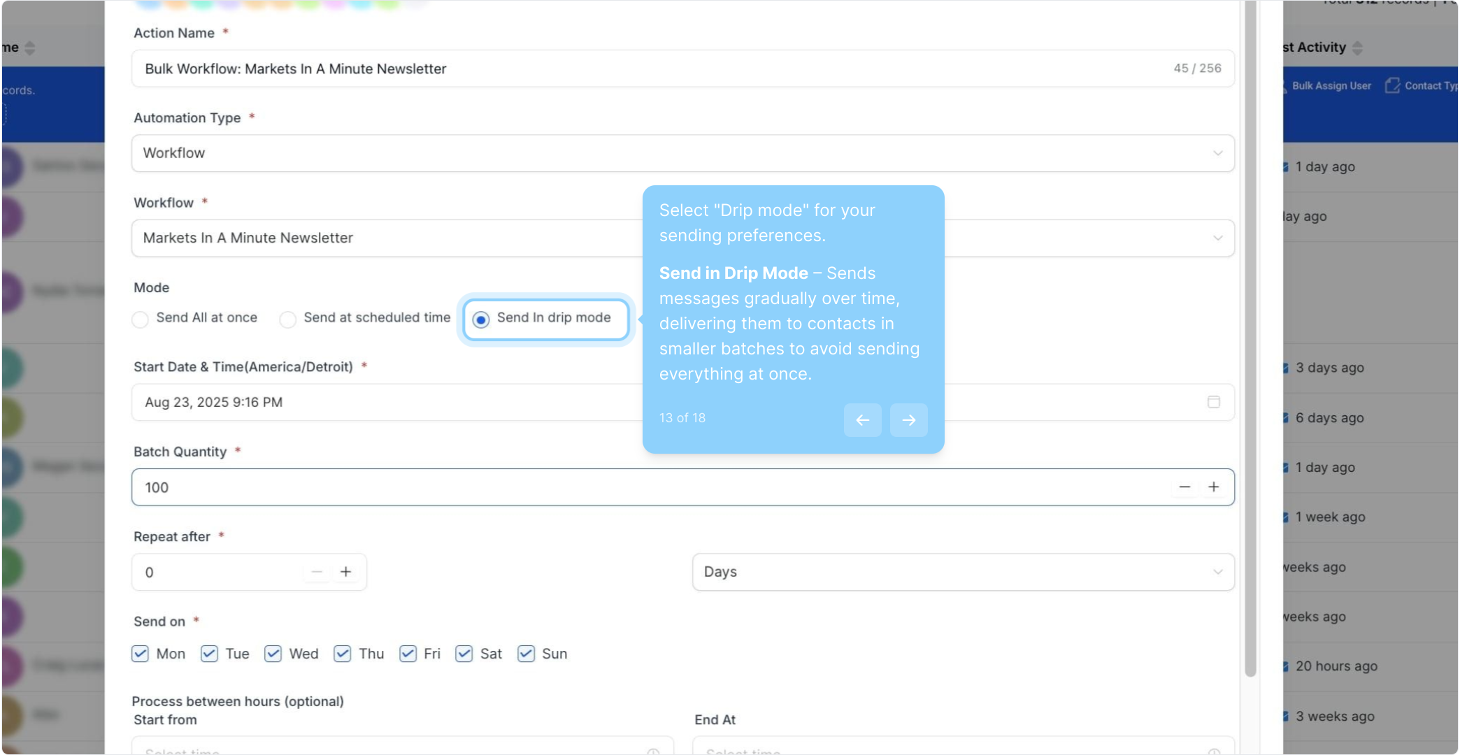 13. Select "Drip mode" for your sending preferences. Send in Drip Mode – Sends messages gradually over time, delivering them to contacts in smaller batches to avoid sending everything at once.