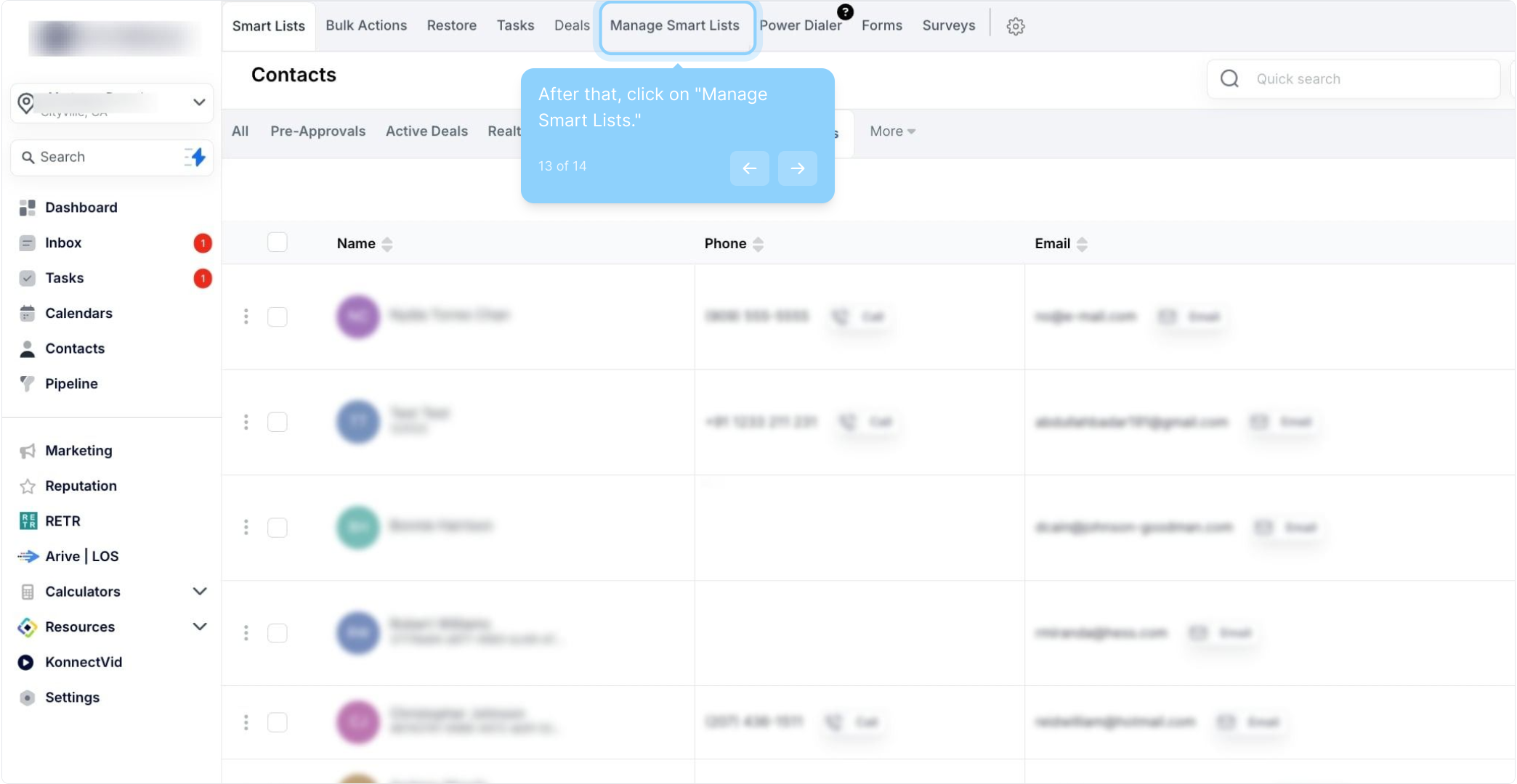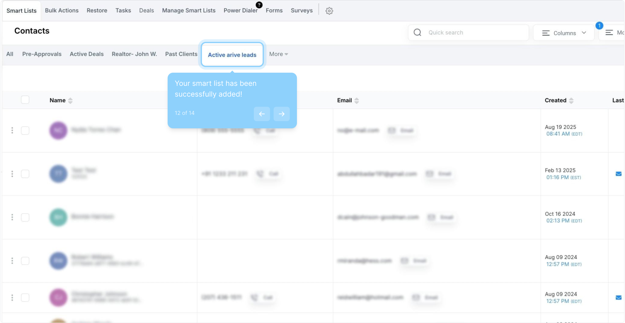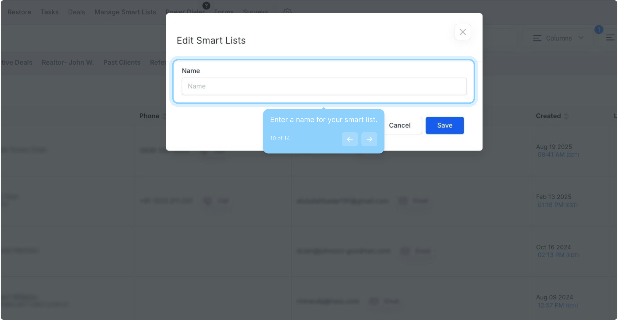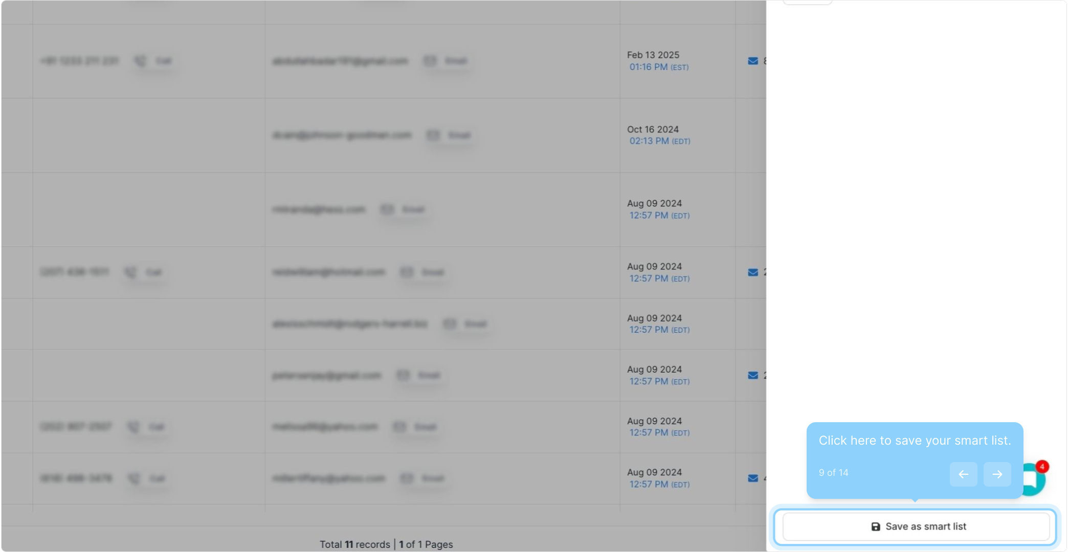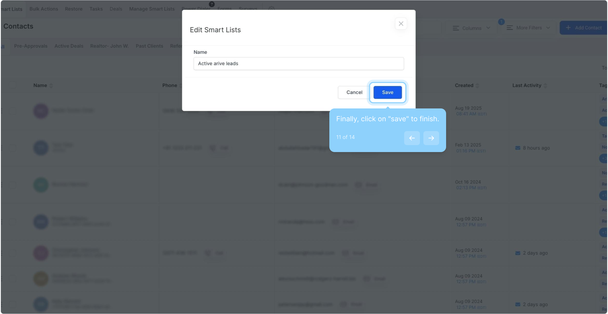 A: Go to the 'Contacts' section, select 'Smart Lists', click on ‘More Filters’ to choose and configure your filters, then save your list by clicking “Save as smart list”.