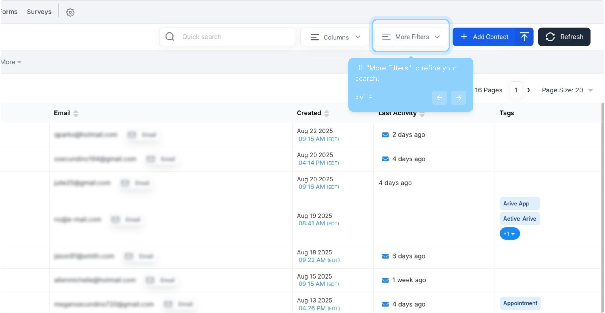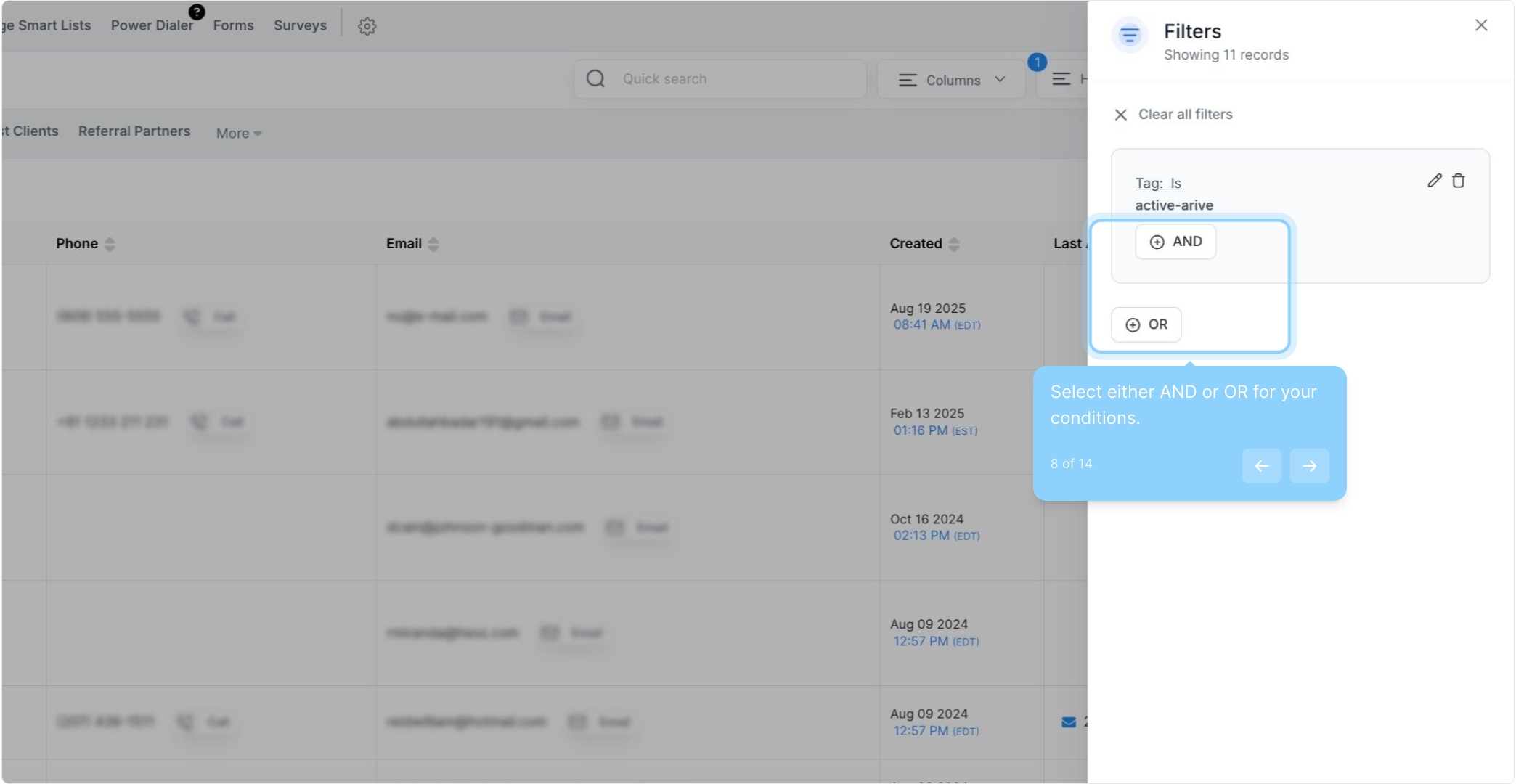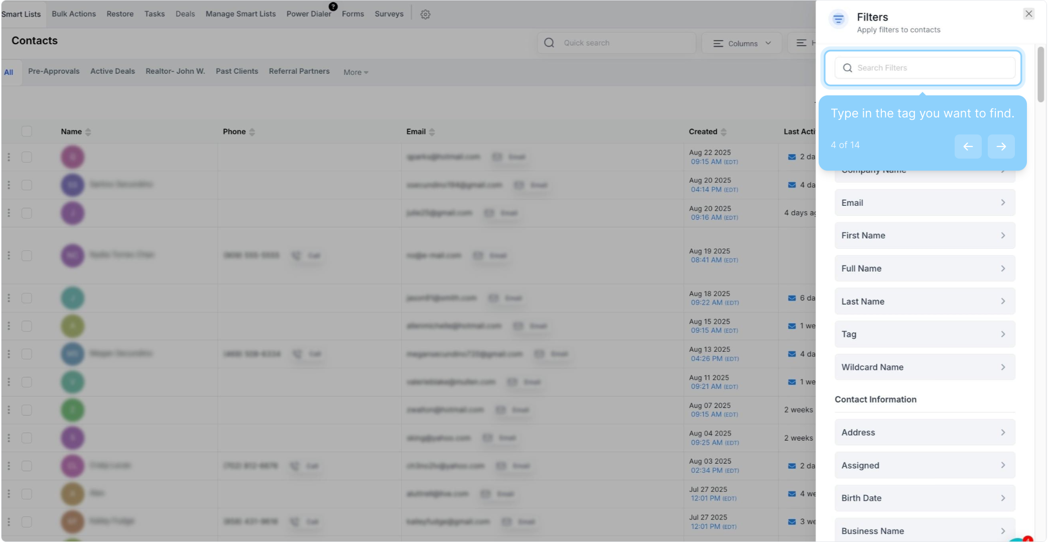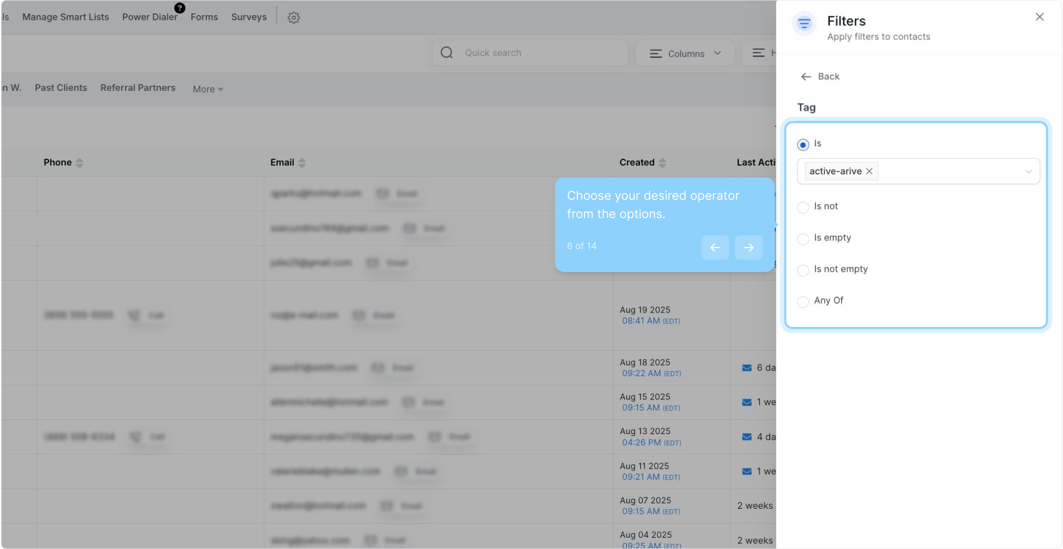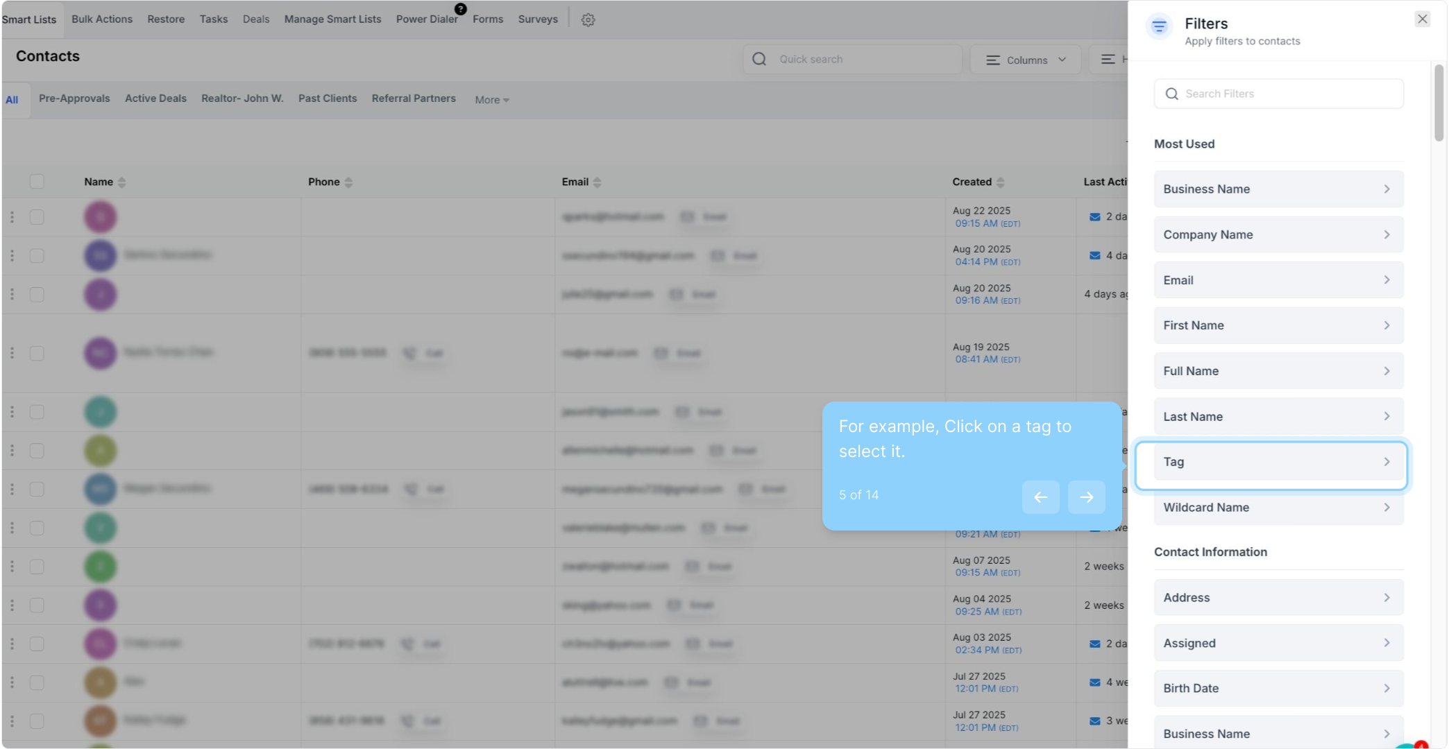 Variety at Your Fingertips: You can pick from basic filters like finding inactive contacts or more specific ones like tagging.