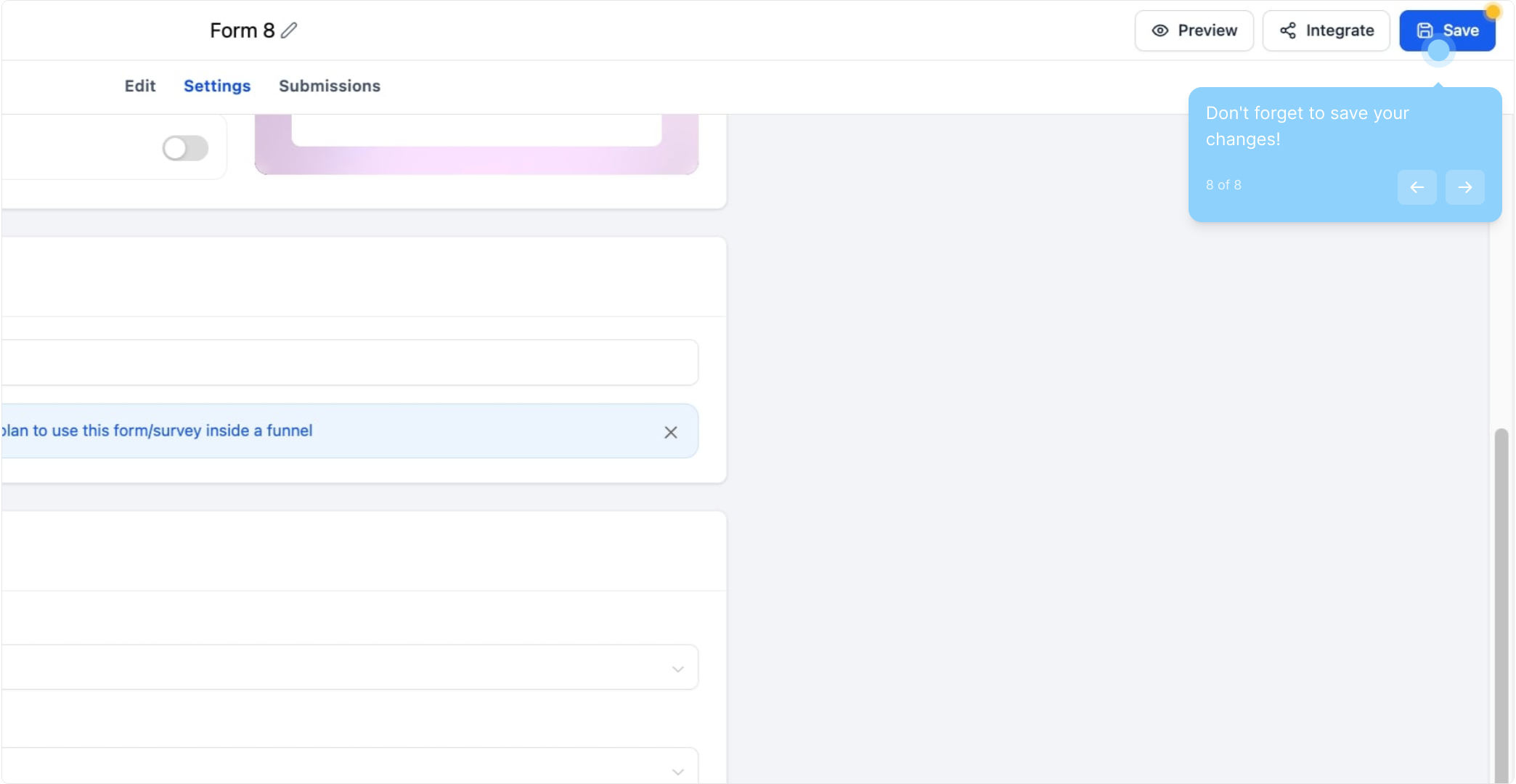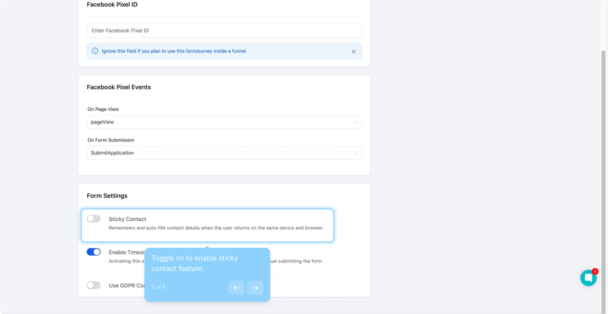Under the form setting,Toggle the switch to the On position to enable Sticky Contacts for the form.