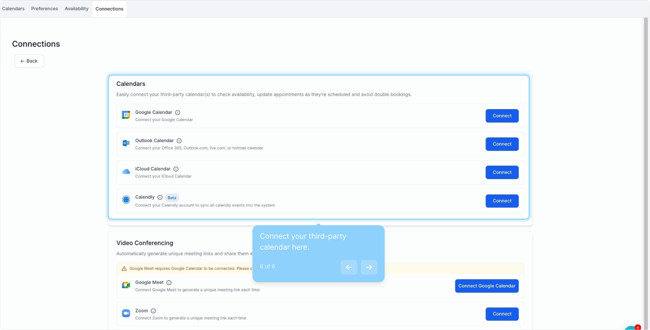With our redesigned UI, you can seamlessly connect your user-level integrations, such as third-party calendars and video conferencing apps, as well as account-level integrations like Google Organic Booking and Local Services Ads, with ease and convenience.