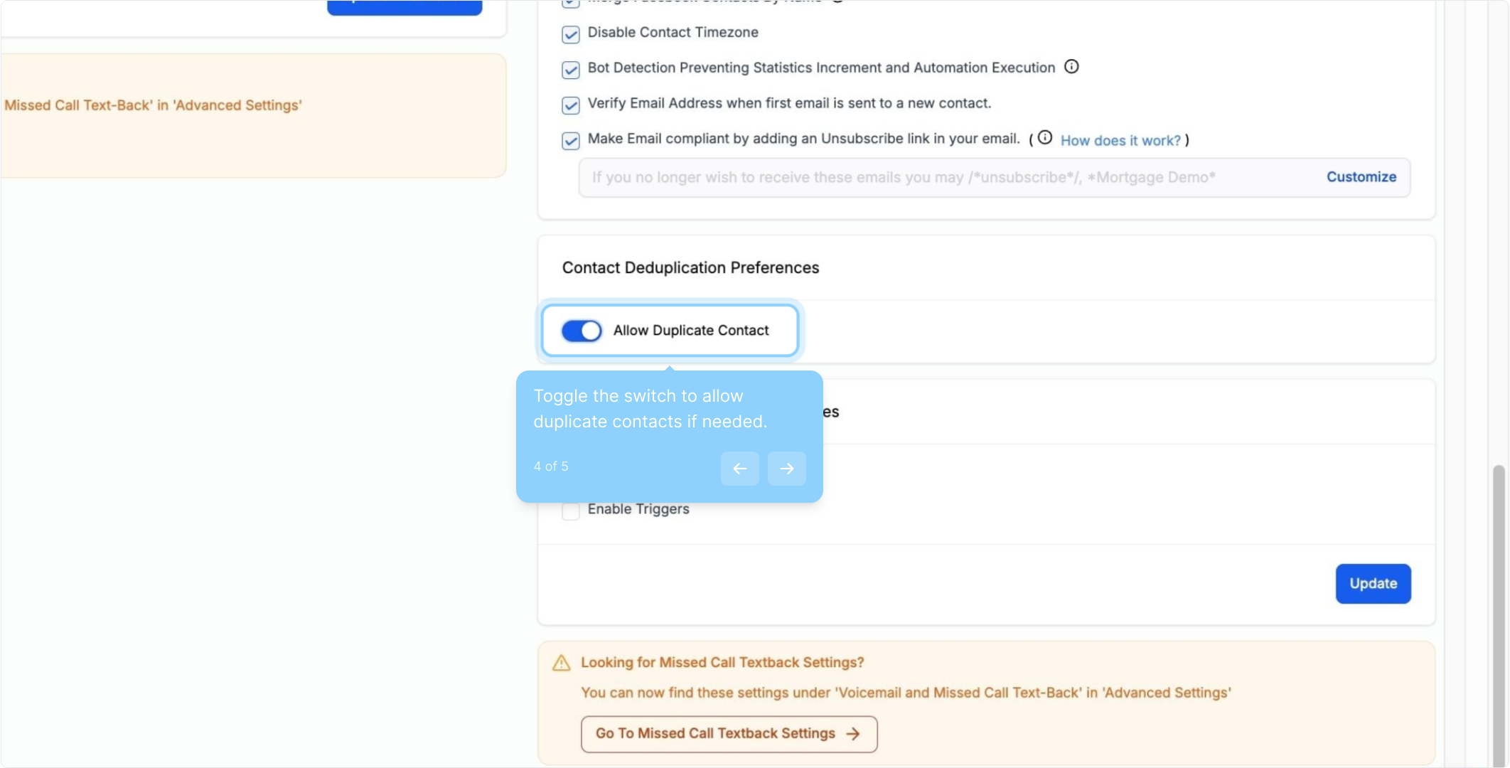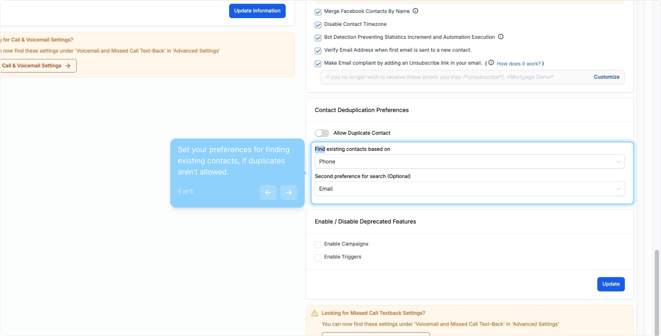5. Set your preferences for finding existing contacts, if duplicates aren't allowed.