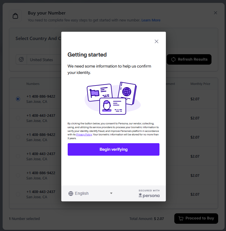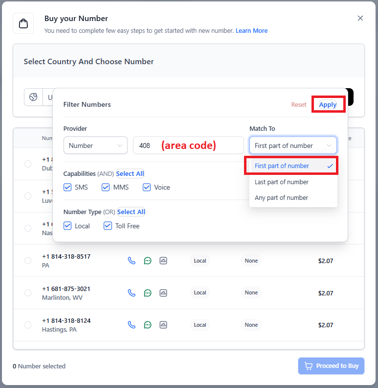 Browse the available options and select the phone number you want to use. Then, scroll down and click “Proceed to Buy”.